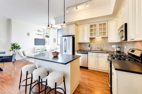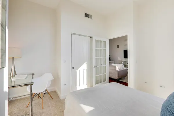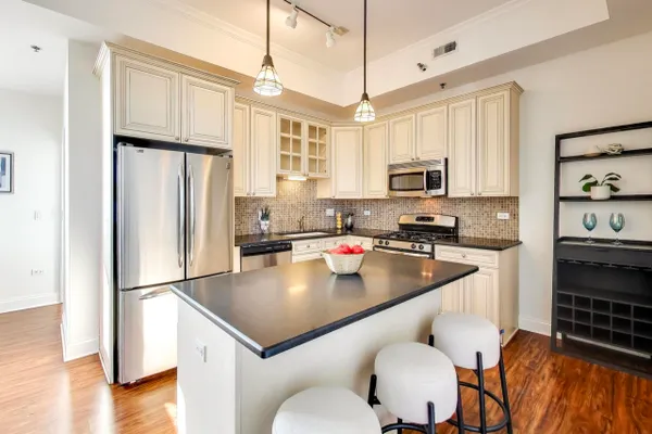Gorgeous 2 bedroom / 2 bath CORNER UNIT in south loop featuring incredible natural light and TWO exceptional outdoor spaces-- a large, private 230sf terrace plus a separate balcony. Highly upgraded, this unit boasts a kitchen with stainless steel appliances, granite counter tops, tiled backsplash and custom cabinets with a large island for entertaining. The combined living/dining rooms showcase custom white built-in shelving, ample space for entertaining, and a sliding door that opens to 25' x 9' terrace with rare, unobstructed sunrise to sunset views! On top of an expansive east lake view, you'll also experience postcard perfect views of the city looking south and west as far as the eye can see! This special unit has a split bedroom layout with the primary bedroom accommodating a king-sized bed, a large walk in closet, brand new carpeting plus a private sliding glass door to the terrace. The primary bathroom features an upgraded glass enclosed shower with new contemporary tile surround and gorgeous penny tile on the basin. Plus, there is a large, separate jetted tub perfect for relaxing after a long day. The second bedroom is ample size with brand new carpeting as well and highlights a private balcony off the room with south and west views! This unit is equipped with speakers throughout, in-unit washer/dryer and individually controlled furnace heat and air conditioning. The building features a 24-hour doorman, fitness center and package room. Pet friendly building with a dog run and dog park close by. A premier parking space is being sold with the unit for additional $25,000. Enjoy being in the center of everything south loop offers--dining, entertainment, transportation, shops, etc.